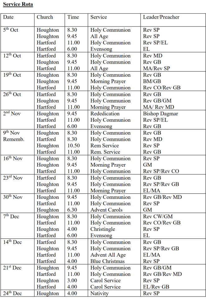 Regular Services SUNDAYS 1st Sunday of the Month 8.30 am 1662 Communion (30 minutes) 9.45 am All Age Worship (45 minutes) 2nd Sunday of the Month 9.45 am Holy Communion 3rd Sunday of the Month 8.30 am 1662 Communion 9.40 am Children's Music & Craft Group (Held at the St Mary's Centre) 9.45 am CW Morning Prayer 4th Sunday of the Month 9.40 am God’s Gang (Meet in the St Mary's Centre, 9:40 - 10:45 a.m., then join in with the main Church service at the end to feed back on what they've learned) 9.45 am Holy Communion 5th Sunday of the Month 9.45 am Family Communion WEDNESDAYS 2nd Wednesday of the Month 9.30 am Midweek Communion (30 minutes) 4th Wednesday of the Month 9.30 am Midweek Communion (30 minutes)